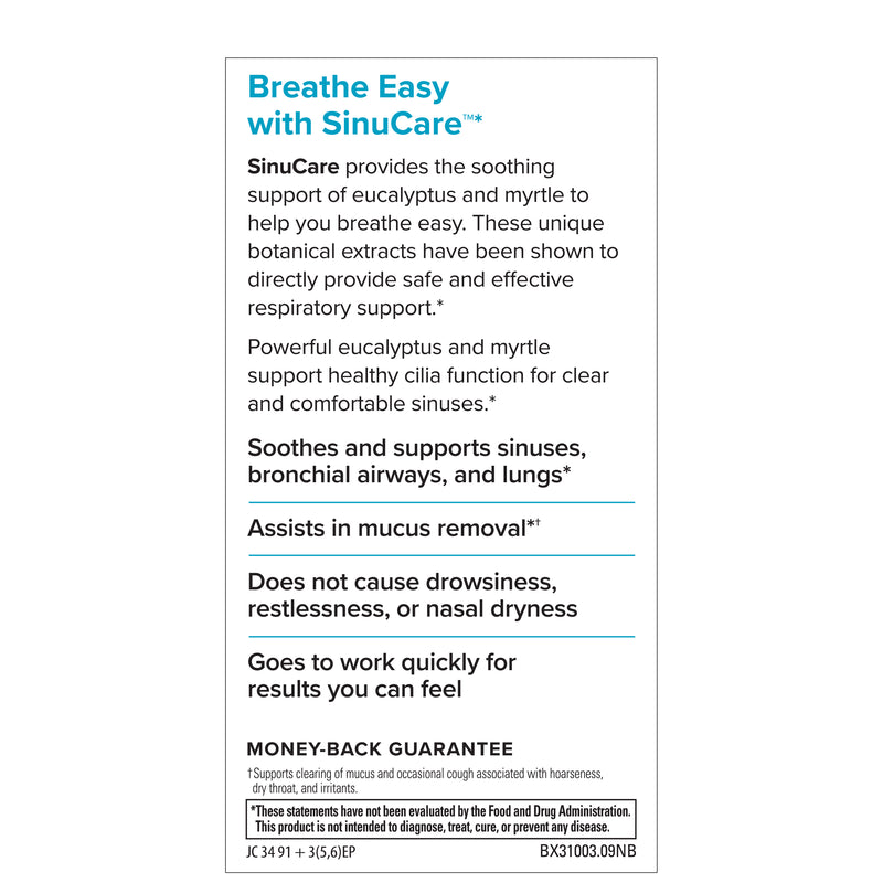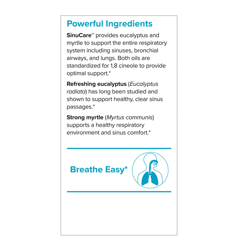 SinuCare provides the soothing support of Eucalyptus and Myrtle to help you breathe easy. These unique botanical extracts have been shown to directly provide effective respiratory system support in part by their ability to support healthy cilia activity.