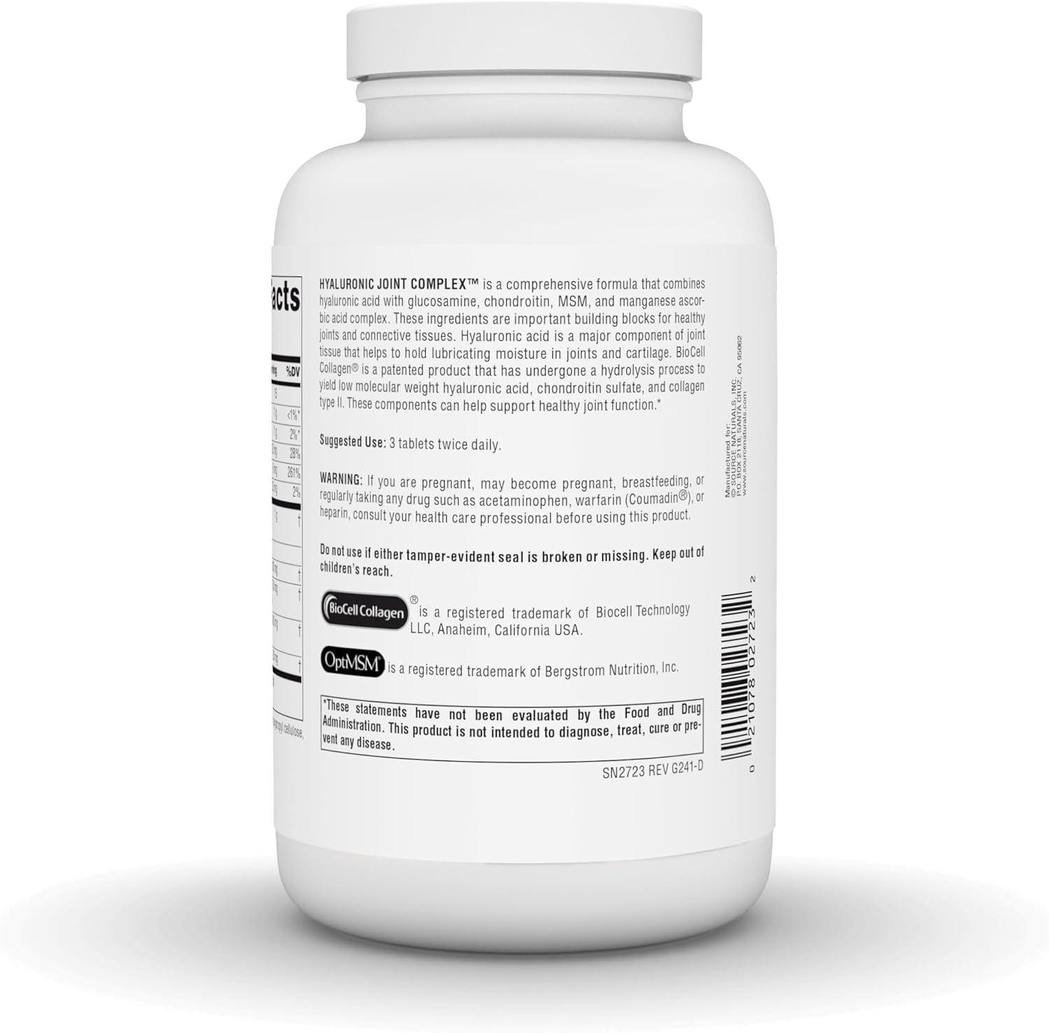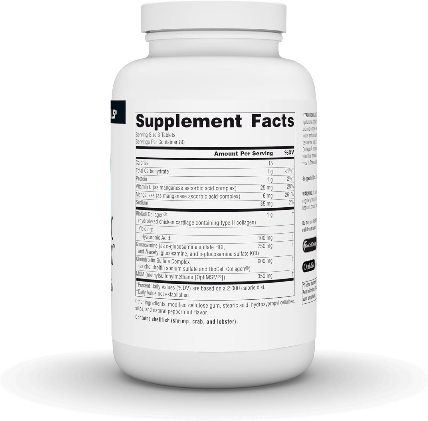 HYALURONIC JOINT COMPLEX™ is a comprehensive formula that combines hyaluronic acid with glucosamine, chondroitin, MSM, and manganese ascorbic acid complex. These ingredients are important building blocks for healthy joints and connective tissues. Hyaluronic acid is a major component of joint tissue that helps to hold lubricating moisture in joints and cartilage. BioCell Collagen® is a patented product that has undergone a hydrolysis process to yield low molecular weight hyaluronic acid, chondroitin sulfate, and collagen type II. These components can help support healthy joint function.