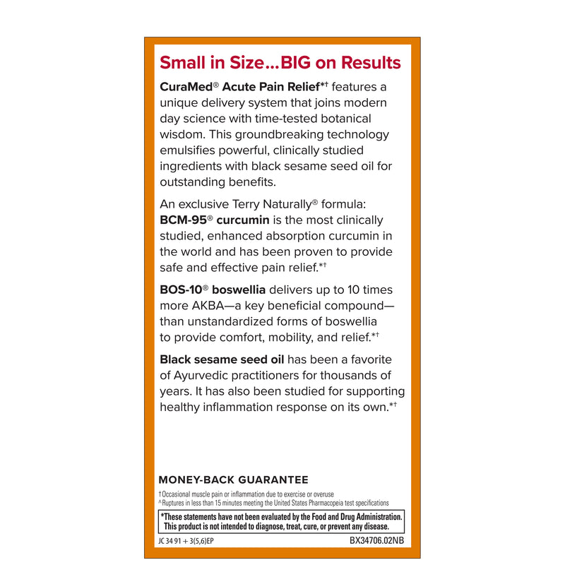 CuraMed Acute Pain Relief features a unique delivery system that joins modern day science with time tested botanical wisdom. This new groundbreaking, clinically proven technology emulsifies powerful, clinically studied ingredients with black sesame seed oil for outstanding benefits! This new formula is exclusive to Terry Naturally, making CuraMed Acute Pain Relief a truly unique product that will help you live an active life.