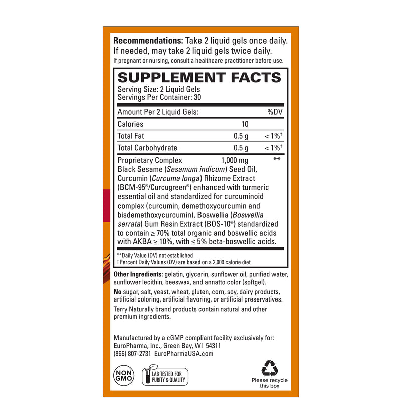 | Proprietary Complex Black Sesame (Sesamum indicum) Seed Oil, Curcumin (Curcuma longa) Rhizome Extract (BCM-95/Curcugreen) enhanced with turmeric essential oil and standardized for curcuminoid complex (curcumin, demethoxycurcumin and bisdemethoxycurcumin), Boswellia (Boswellia serrata) Gum Resin Extract (BOS-10) standardized to contain ≥70% Total Organic and Boswellic Acids with AKBA ≥10%, with ≤5% beta-boswellic acids. |