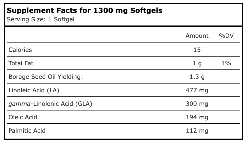 Borage Super GLA 300 is an oil concentrate expressed from the seeds of the uniquely high-yielding borage plant using a specialized, non-toxic, solvent-free, cold-pressed extraction technique. Each softgel capsule contains 1,300 mg of borage seed oil, yielding 300 mg of gamma linolenic acid and 446 mg of linoleic acid.