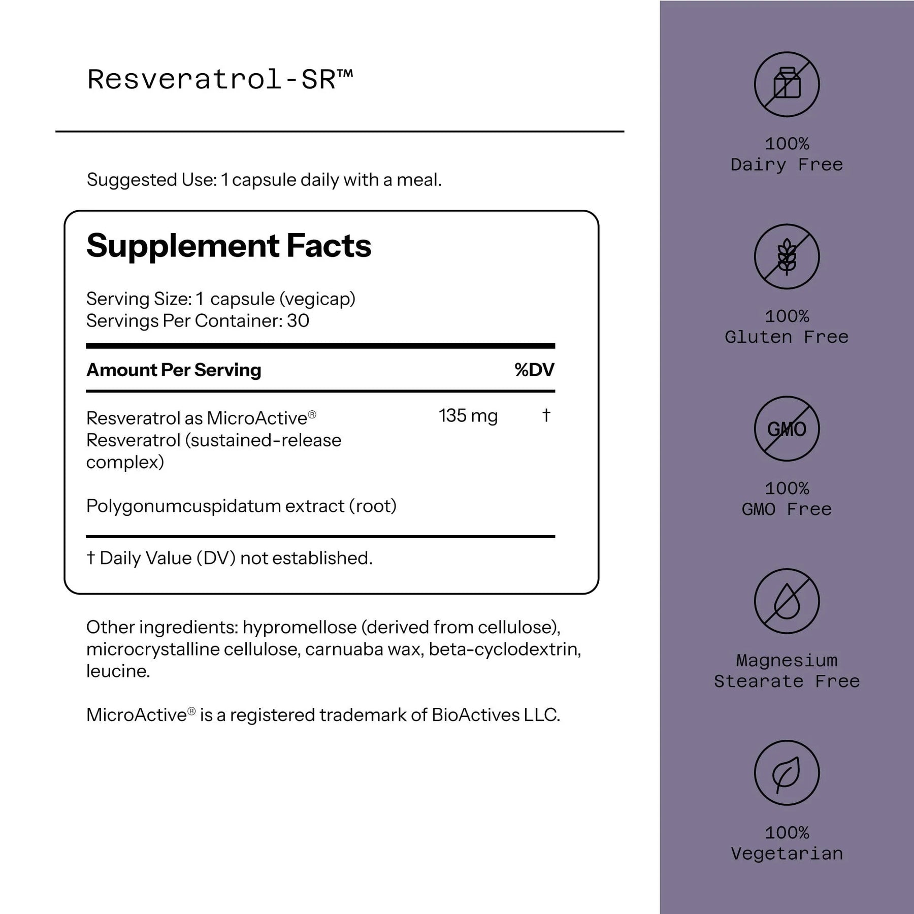Resveratrol, a phytonutrient found in grapes and red wine, has tremendous potential to support a healthy lifespan.* However, since resveratrol has a short half-life, so it doesn’t stay in the bloodstream long — making it hard to reap its full potential. Resveratrol-SR™ features MicroActive® Resveratrol Complex, which releases resveratrol over 12 hours and has 2.5x better bioavailability than regular resveratrol.