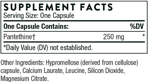 Pantethine – an active form of pantothenic acid, or vitamin B5 – is a vital component of coenzyme A, a cofactor in dozens of enzymatic reactions, including reactions involved in fat and carbohydrate metabolism.* Pantethine appears to facilitate the metabolism of fatty acids by activating coenzyme A, which promotes carnitine's transport of fatty acids into the mitochondria and subsequent intra-mitochondrial oxidation of those fatty acids.* Consequently, pantethine supplementation has been found to support good cardiovascular health.* In addition, increases in beneficial HDL cholesterol and apolipoprotein A1 have been associated with pantethine supplementation.* Pantethine is also considered to be an "anti-stress" vitamin because it supports healthy adrenal cortex function and hormone synthesis, particularly during times of stress.*
