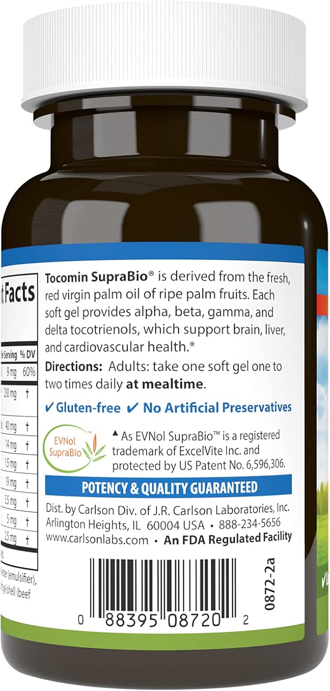 Tocomin SupraBio® is derived from the fresh, red virgin palm oil of ripe palm fruits. Each soft gel provides alpha, beta, gamma, and delta tocotrienols, which support brain, liver, and cardiovascular health.