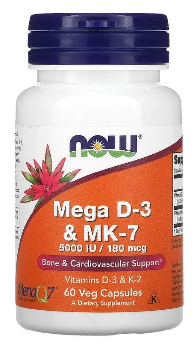 NOW® Mega D-3 & MK-7 combines vitamins D-3 and K-2, two nutrients extensively researched for their roles in the health of bones, teeth and the cardiovascular system. Vitamin D-3 works with calcium to support bone health, and more recent studies indicate it's important for immune system health as well. MenaQ7® MK-7 is a unique soy-free, bioavailable form of vitamin K-2 that plays a critical role in arterial health through its ability to support proper calcium metabolism in blood vessels and arteries. Vitamin K-2 is also important for the formation of strong, healthy bones.
